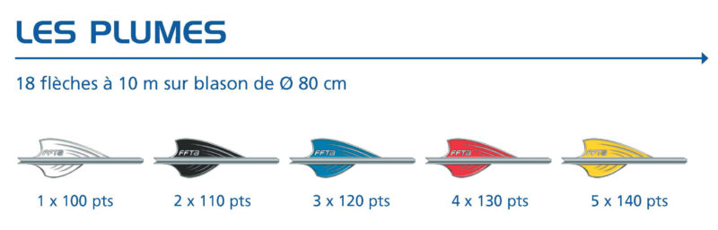 Pour l’obtention des plumes il faut tirer 18 flèches en 3 volées de 6 sur une cible de 80 cm placée à 10 m (ou moins pour les moins de 10 ans)