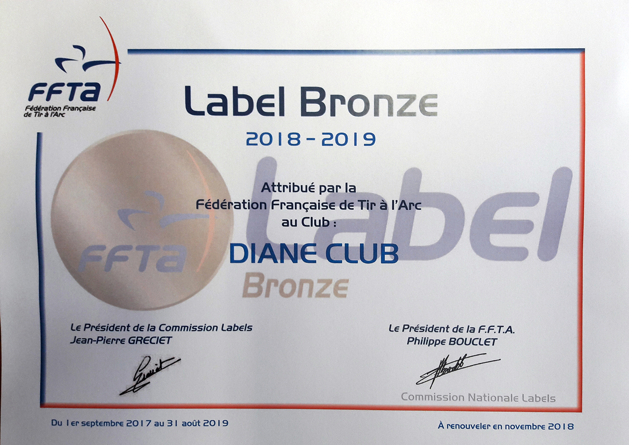 Le Diane Club est de nouveau récompensé par la FFTA et reçoit le Label Bronze.