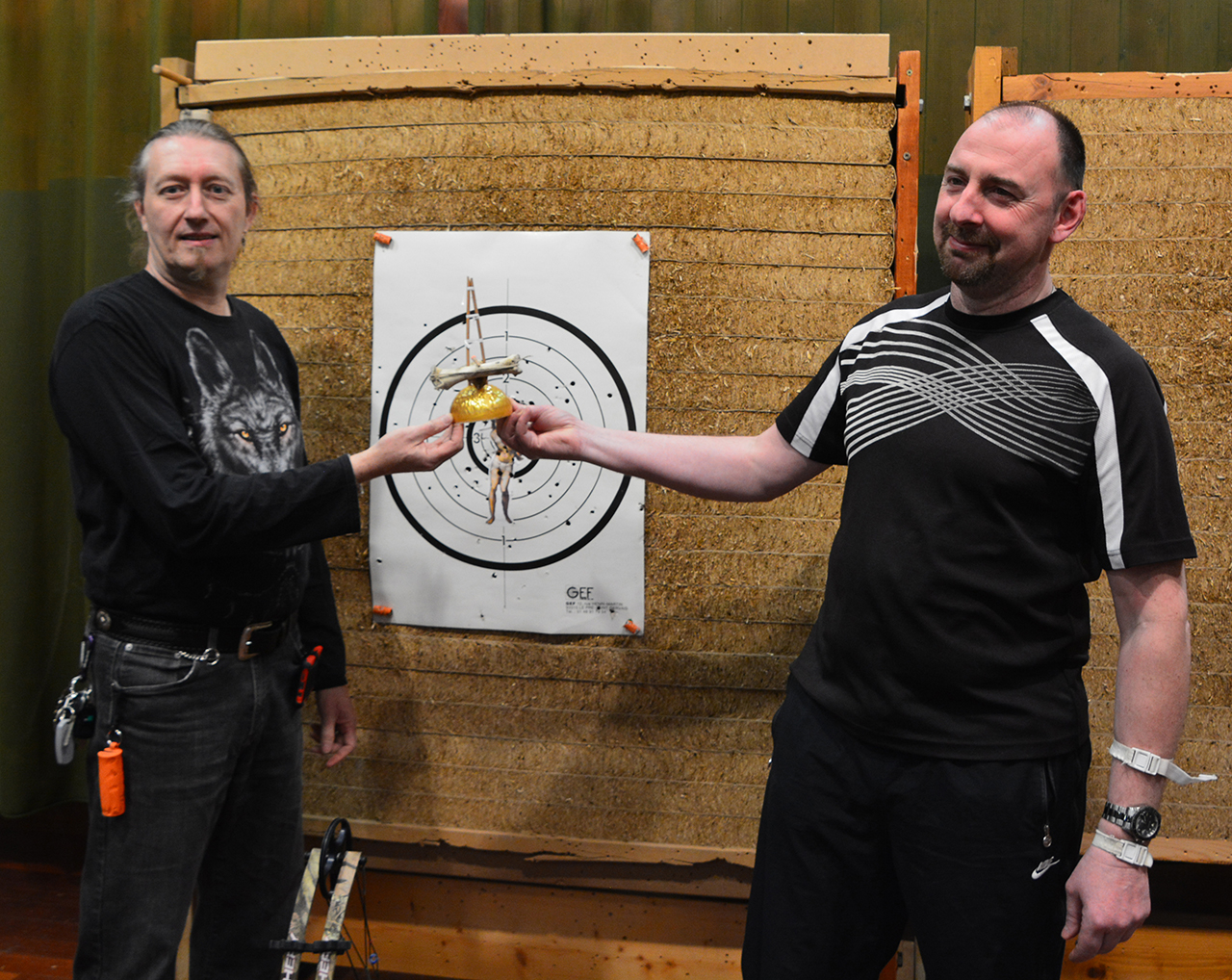 Fabrice, le gagnant de l’année dernière remet à Michel le trophée qu’il a réalisé, conformément à la règle ancestrale du Diane Club 😉
